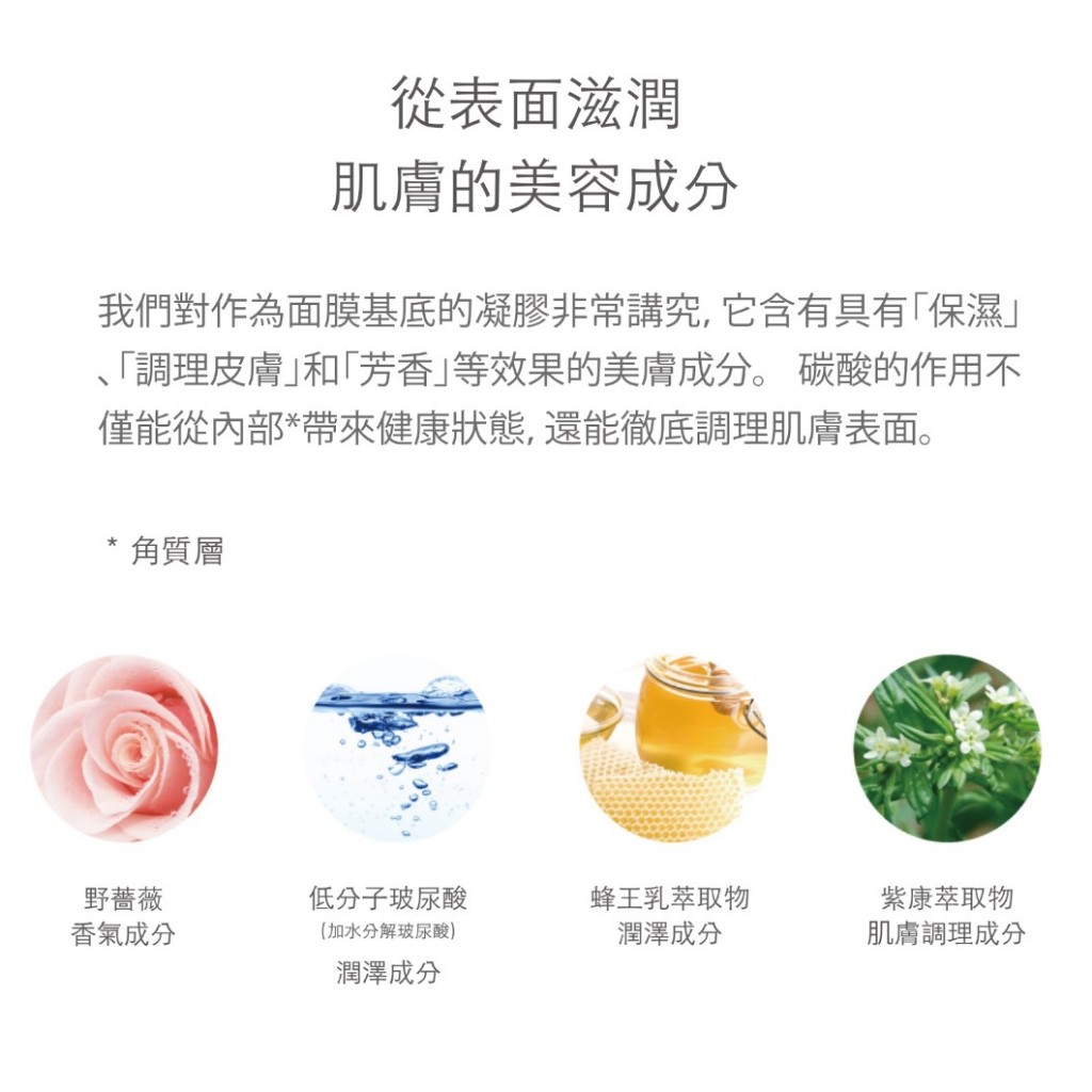 我們對作為面膜基底的凝膠非常講究,它含有具有「保濕」、「調理皮膚」和「芳香」等效果的美膚成分。碳酸的作用不僅能從內部※帶來健康狀態,還能徹底調理肌膚表面。