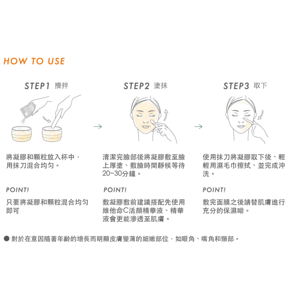 敷凝膠敷前建議搭配先使用維他命C活顏精華液,精華液會更能滲透至肌膚。