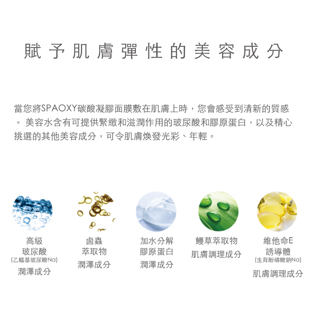 當您將SPAOXY碳酸凝膠面膜敷在肌膚上時,您會感受到清新的質感。美容水含有可提供緊和滋潤作用的玻尿酸和膠原蛋白,以及精心挑選的其他美容成分,可令肌膚煥光彩、年輕。