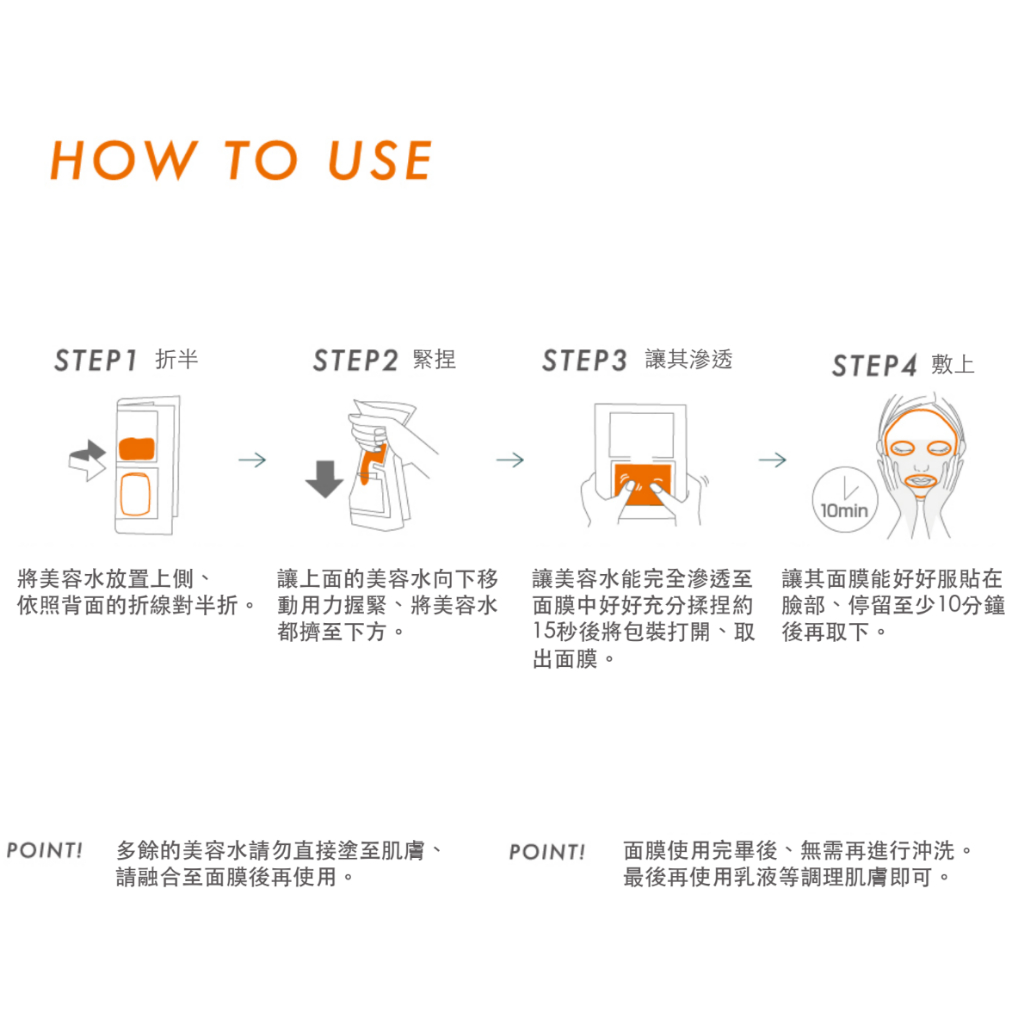 ✓步驟非常簡單步驟,使用前只需混合美容水,將面膜敷在皮膚上10分鐘